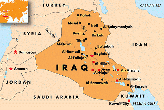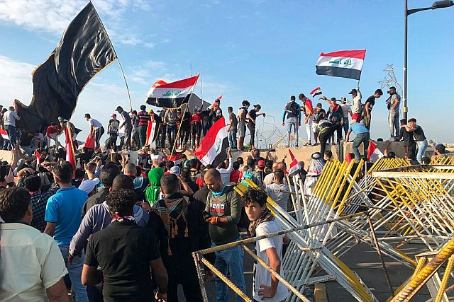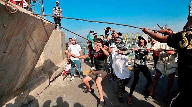 25日には、首都バグダッドBaghdad中央にあるタリハール広場Tahrir Square に数百人のデモ隊が終結し、一部が、国会や官庁、各国大使館などのあるグリーンゾーンThe Green Zoneを囲むコンクリート壁を破壊するなどした。:右