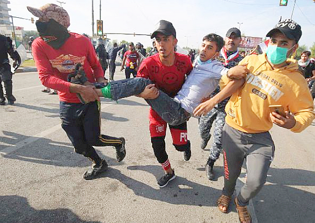 政府はすでに、雇用増加、住宅建設財源の見直し、汚職摘発などを公表し、マフディーMahdi政権は新たに、大統領を含むイラク政府閣僚、国会議員らの給与を大幅に削減するなどの提言をする一方、各地方首長が24時間の完全夜間外出禁止令a 24-hour curfewを発行することに認可を出し、デモの拡大阻止に躍起になっている。右写真の右は10月25日、バグダッドのタ