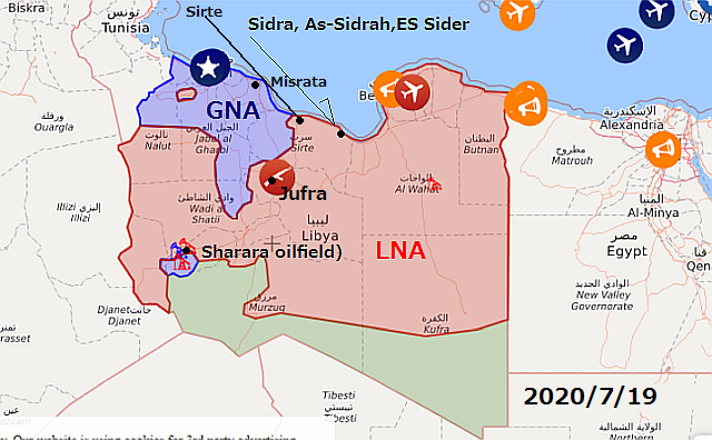 国際的にリビア政府と認可されたGNA国民合意政府軍:Libya's internationally-recognised Government of National Accord (GNA) は現地2020年7月18日、シルトSirte奪還に向け行動を開始し、ミスラタMisrata(Misurata)方面から約200台の車両がシルトへ向け東進していると報道された。右戦況図は今も7月13日と変化はないので、同図に日付と地名追記。ハフタルHaftar率いる国民軍LNA: Libyan National Armyは、2020年1月よりシルトの地元民兵組織を排除し占拠を続けていたが、6月のGNA側の攻勢で一旦撤退し、その後、シルトにはLNAを支援するロシア軍事企業が派遣したシリア人傭兵やスーダン人傭兵、LNA兵士らが再び防衛に就いていると言われている。