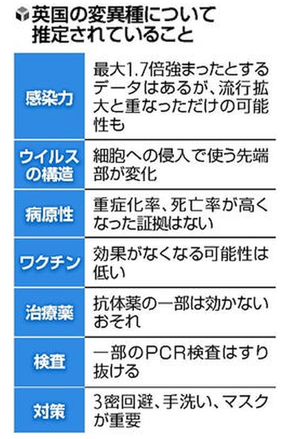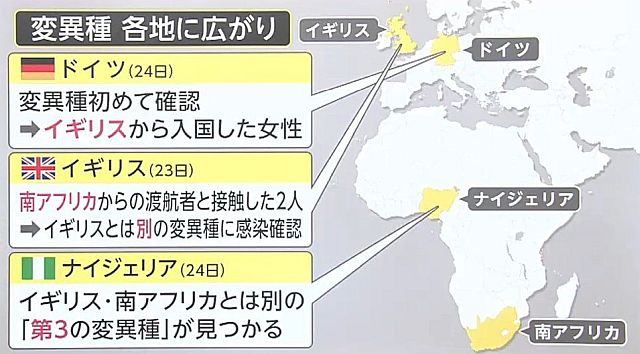 ウイルスの変異は珍しくなく、新型コロナは約2週間に1回のペースで変異を重ねている。中国で昨年見つかった初期型は、今春に変異種の欧州型が世界に広がると姿を消した。こうした種の交代例もあるが、大半の変異種は性質が変わらない。国立感染症研究所によると、日本でも春の拡大期に欧州型の変異種が約300確認されたが、性質はほぼ同じで、大半は消えてしまった。だが英国の変異種は、新型コロナの感染力に関わる構造(突起の先端部)が変化。さらに感染者の急増と同時期に広がり、感染力は従来の最大1・7倍と推計された。ただ感染の拡大時期と変異種の出現が偶然重なった可能性もあり、感染力の結論は出ていない。南アフリカで見つかった異変種は「501.V2]で、英国でも確認され、ナイジェリアで見つかった異変種は28日時点で、特定を急いでいる最中とある。 参照記事 参照記事 新型ウイルスの変異種、いまわかっていること SPring-8 NEWS 特別号(2020.9月) 過去ブログ:2020年12月英国で発見の新型コロナ変異体は感染速いがワクチンは有効と