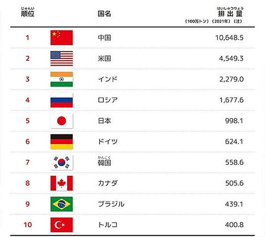 、、、改めて、温室効果ガスが、CO2だけでは無いことも再確認すべきだろう。ちなみに外務省が子供向けに提供している資料によると、二酸化炭素の排出量の多い国ランキングは右の通りだ。 World Bank Open Dataによると、1990-2020の10年間で地球全体の二酸化炭素排出量は 34,344,006ktとなっている。そのうち中国が31.18%、アメリカが14.03%、インドが7.15%、ロシアが4.96%、日本が3.15%だ。 二酸化炭素削減の鍵は特に中国とアメリカ、インドが握っているようだ。映像と記事:地球上の二酸化炭素がどこから発生してどう動いているのかを可視化したNASAの動画: