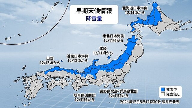 気象庁は2024年12月5日、北海道、東北、関東甲信、北陸、東海、近畿、中国地方に「大雪に関する早期天候情報」を発表した。東北日本海側では12月11日頃から5日間降雪量が平年比233%以上と見込まれるということだ。「早期天候情報」はその時期としては『10年に一度レベル』しか起きないような著しい低温や高温、降雪量となる可能性が、いつもより高まっている時に注意を呼びかけるために出される情報という。