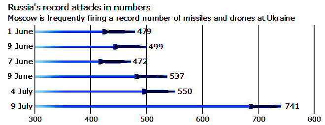2025年6月から7月にかけて、ロシアのウクライナに対するミサイル、無人機の攻撃は記録的に増大している。右図はウクライナへの日々の無人機、ミサイル攻撃回数を示している。国連のウクライナ人権監視団は、2025年6月のウクライナにおける民間人犠牲者数は、過去3年間で最大数となったとし、死者は232人、負傷者数は1343人だったと報告した。参照記事