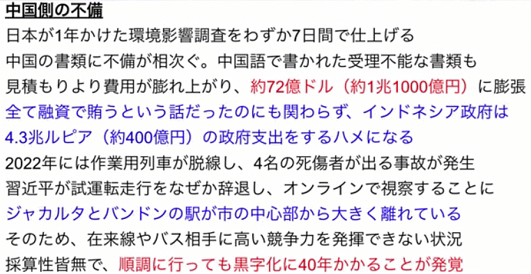 、、、、ここ数年の経過を箇条書きにしたのが左で、約110億円の国費投入も焼け石に水の状態のようだ。当然、車両や設備の老朽化で赤字の中で莫大な追加予算も必要になるだろう。国際的にも、典型的なインフラ整備の失敗例と言われる中、いつまでこの高速鉄道を維持できるのか?他国のことながら心配になる状況だ。過去ブログ 2023年10月インドネシア高速鉄道が2023年10月2日、正式に開業:2020年6月インドネシアの高速軌道化にまた異変 すでに2年遅れの中国: