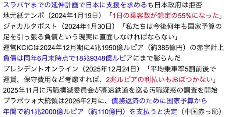 頻繁に映像記事に登場するインドネシア新幹線の話題だが、2026年2月10日時点で、いったいどんな状態なのか?映像記事は:インドネシア高速鉄道が利払いできず、ついに政府介入!さらに汚職まで発覚する最悪の事態に!:と伝えている。結論から言えば、今後インドネシアは、利息だけで年間約1億2000万ドル(約187億円)を払い続けなければならず、この鉄道、走るだけ赤字になるという。