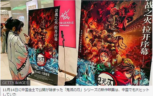 CCTVは、高市首相の発言を受けて「劇場版『鬼滅の刃』無限城編」に対して「中国の観客が強い不満を抱いている」と伝え、中国の映画配給会社や輸入業者は、中国市場での日本映画の全体的な見通しに加え、中国の観客の気持ちを検討し、公開延期を決めたという。14日から中国全土ですでに公開中の「劇場版『鬼滅の刃(やいば)』無限城編 第一章 猗窩座(あかざ)再来」については、公開中止になるかどうかはCCTVは伝えていないが、対立が深まる中でチケット販売が減少していると報じた。