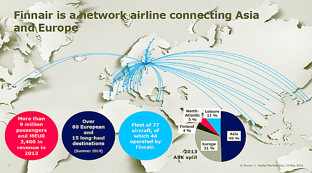同社はヘルシンキから欧州の100都市以上に路線を張っている。実際、日本発着の旅客のうち、8割はヘルシンキで乗り継ぎ、他の欧州の都市へ向かう。ヘルシンキが最終目的地という客は残りの2割にすぎない。
