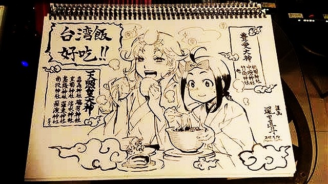 絵には楽しそうに食事を頬張る女性二人が描かれている。中国語で「台灣飯好吃!!」(台湾のご飯がお いしい!!)と書かれたほか、「桃園、中壢、竹南、瑞芳、宜蘭、淡水」など観光した場所も記された。絵の右下に「颯田直斗」とのサインがあった。