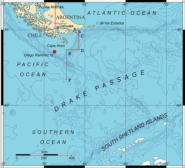 今回コニュホフさんは2018年12月に南太平洋South Pacificのニュージーランドを出発後、ホーン岬 Cape Horn(チリ)に向い、2019年5月9日にチリ沖のドレーク海峡に在るラミレス島 Diego Ramirez Islands in Drake Passage off Chileに到達した:写真右。この第1段階が、世界1周コースの中で最も長い。今後2019年12月には、ホーン岬から東へ進みルーウィン岬:オーストラリア:Cape Leeuwin in Western Australia まで、2020年12月にはオーストラリア・ルーウィン岬から最終目的地ニュージーランド ・ダニーデンDunedin, New Zealandへ向かう予定。各段階の平均日数は120日、総航行距離は2万7000キロとなる。